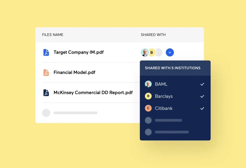 A modular data room which supports the entire life cycle of your deal. A centralized hub for all of your data and documents which enables you to track, monitor and report on your deals.