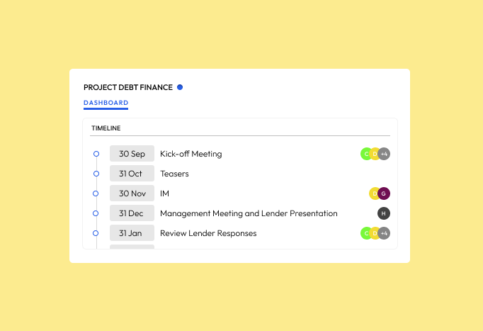 No more manual Excel tracking sheets. The deal dashboard provides a holistic snapshot of your timeline, lender task progress, and all activity in the data room, communications portal, and termsheet functions.